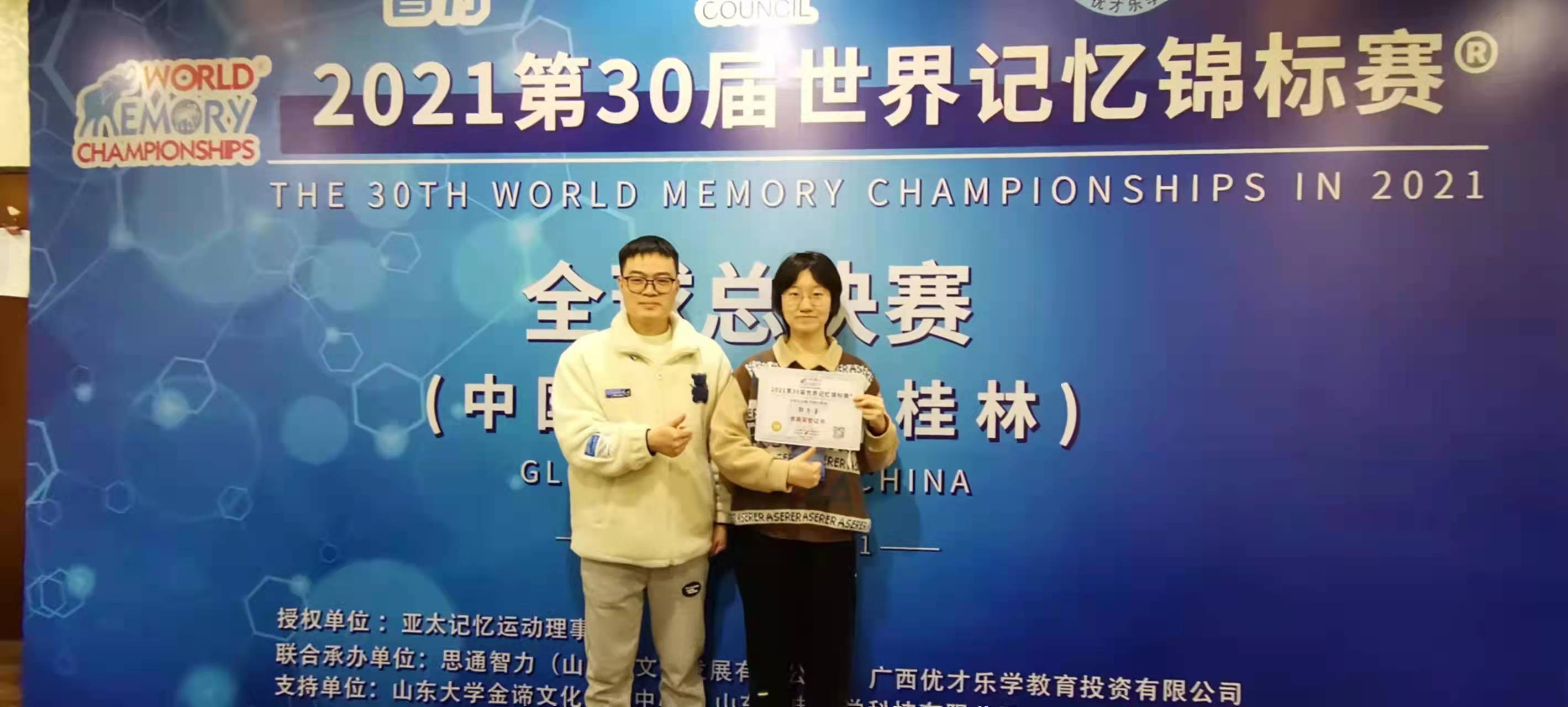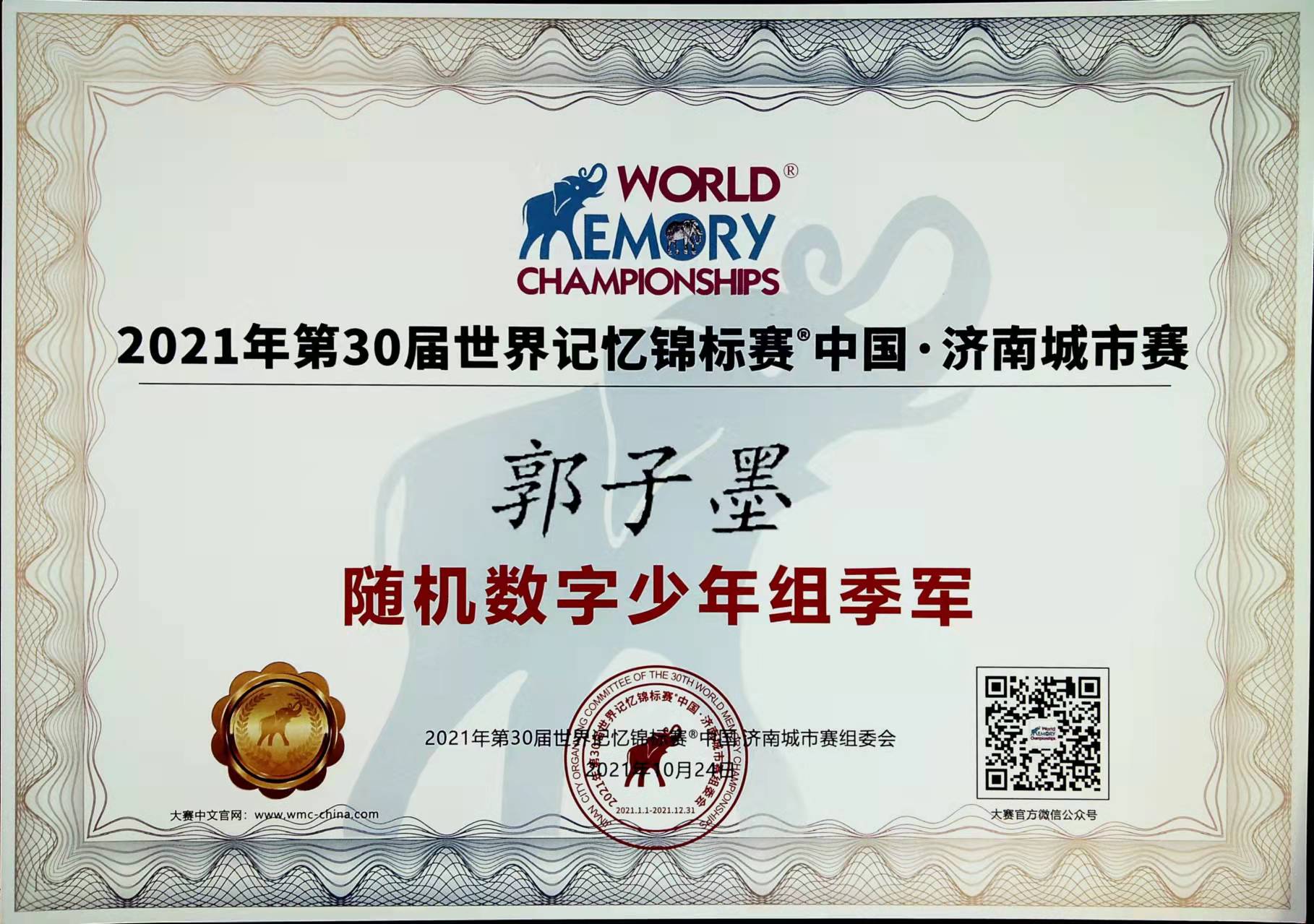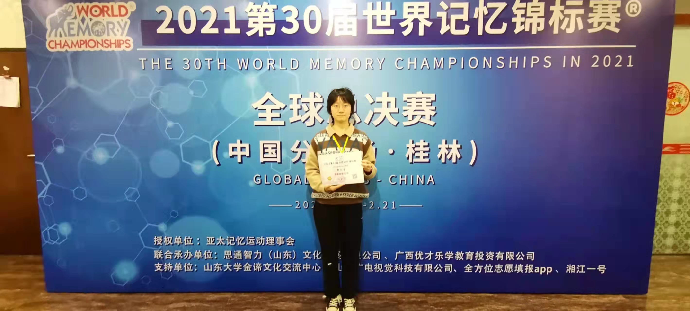 在完成东方巨龙记忆大师集训营后,我在家针对比赛项目进行了数月的复训,并参加了世界脑力锦标赛济南区域赛,获得了中文词汇少年组冠军和随机数字少年组季军。 这次比赛取得的好成绩,大大增强了我成为世界记忆大师的决心.