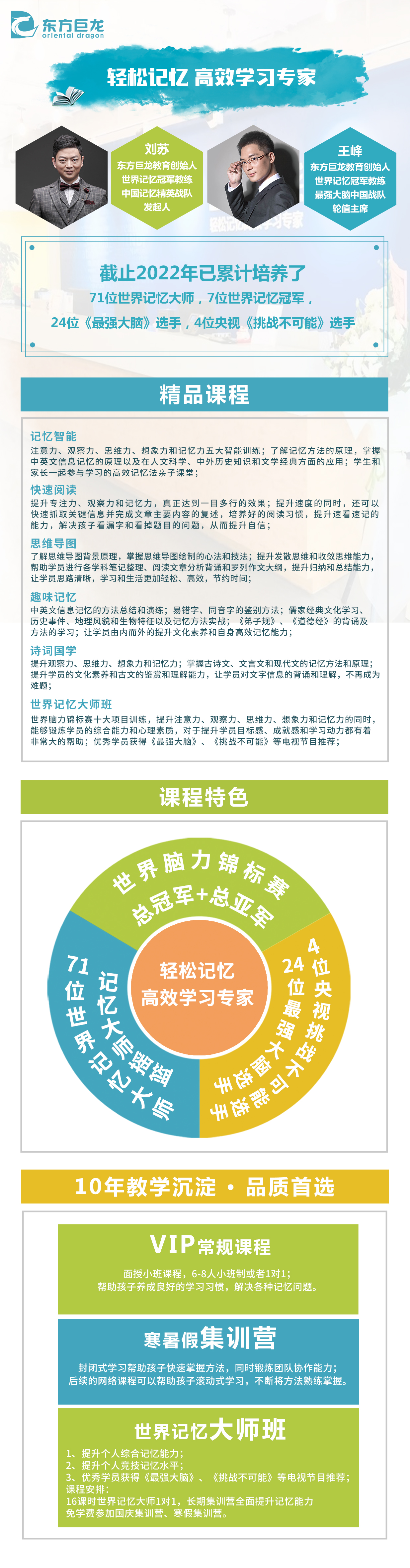 在以后的道路上,比拼的是综合实力,想要不被这个世界淘汰,唯有掌握高效学习能力,以不变应万变。 让东方巨龙教育的冠军记忆大师们来帮助你提升大脑,轻松记忆,高效学习。