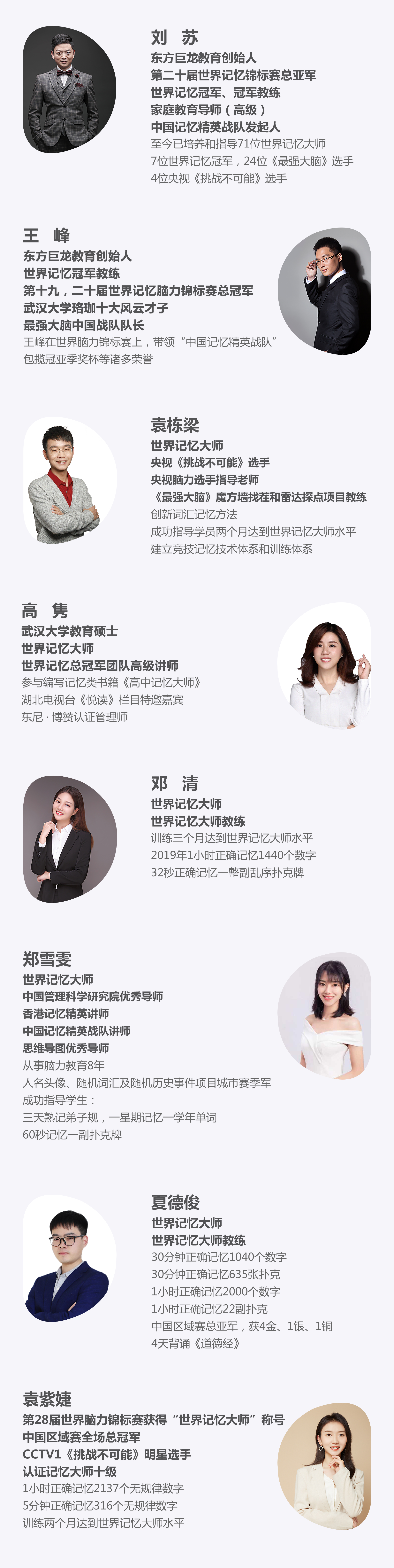 东方巨龙教育拥有亚洲首位世界记忆总冠军王峰、世界记忆总亚军刘苏等各大记忆冠军名师,截至目前已经培养了71位世界记忆大师,7位世界记忆冠军,24位最强大脑(选手)以及4位央视挑战不可能选手。